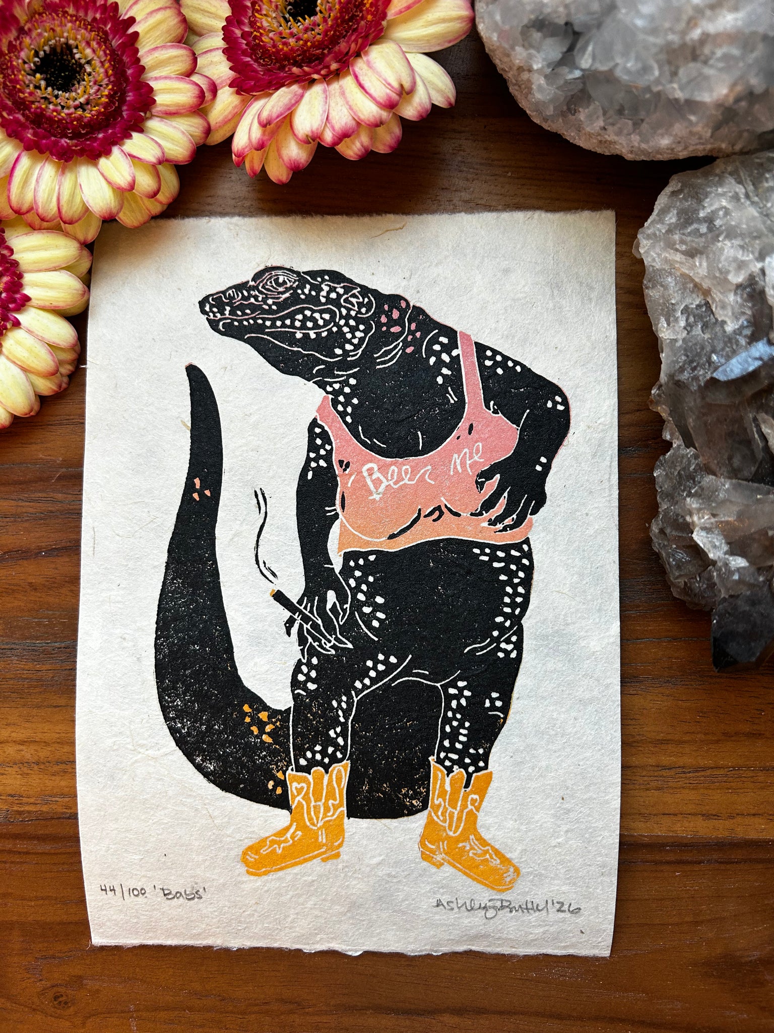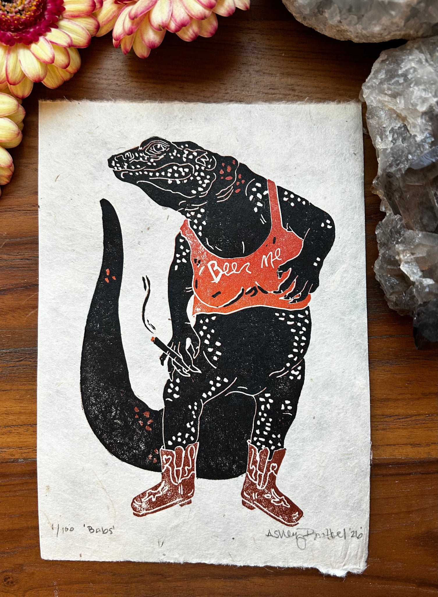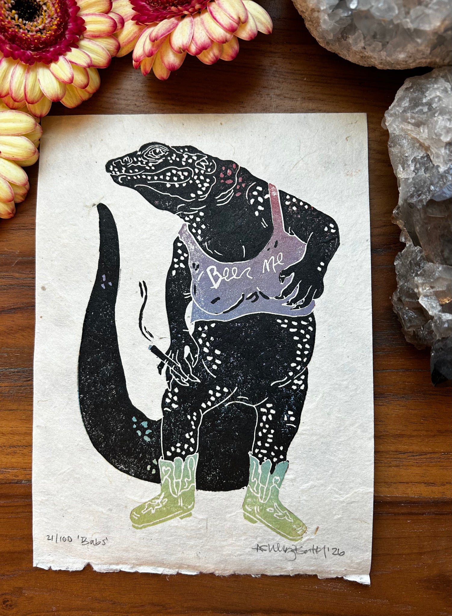 Babs, a chuckwalla sweetheart living her best life. Handmade using reduction printing techniques, from a hand-carved block, printed on archival paper using professional block printing ink. Numbered, titled, and signed along front bottom.